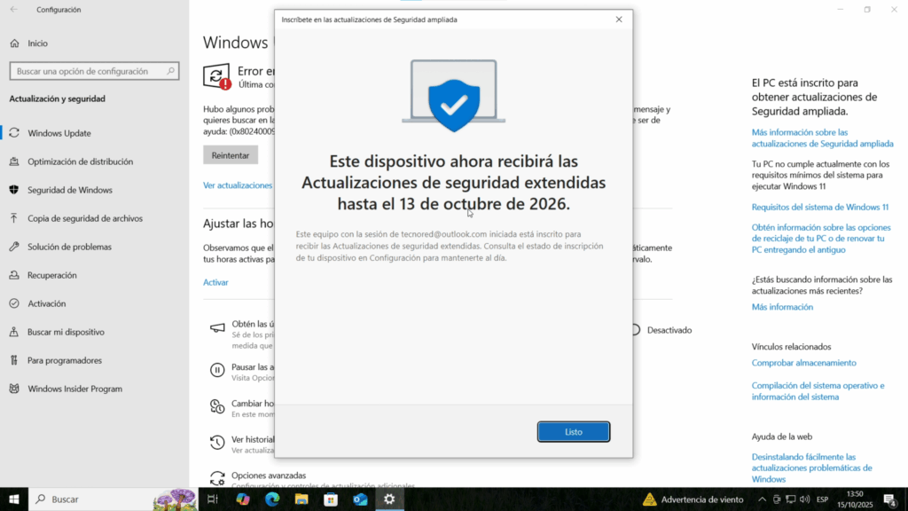 Windows 10 dejó de recibir soporte oficial de Microsoft el 14 de octubre de 2025. Sin embargo, gracias al programa Extended Security Updates (ESU), aún es posible seguir usando este sistema operativo con actualizaciones de seguridad por al menos un año más, de forma segura, gratuita y legal. En este artículo te explicamos cómo activar el soporte extendido paso a paso, incluso si la opción no te aparece en Windows Update.